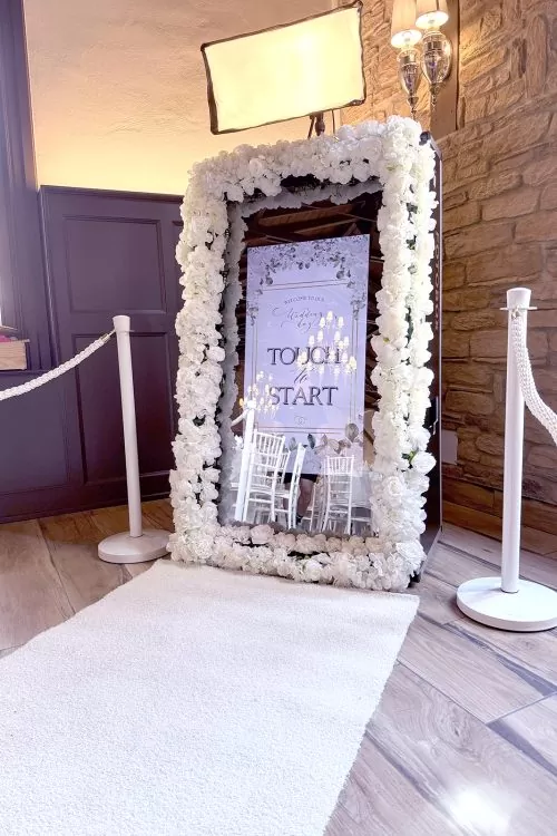 Add elegance and style to your white wedding with our Magic Mirror photo booth. Choose from exclusive frame options such as the “White LED Baroque Frame” or a flower frame with white carpet to perfectly showcase your wedding. The interactive photo mirror ensures unforgettable memories and offers instant prints as special mementos for your guests.
